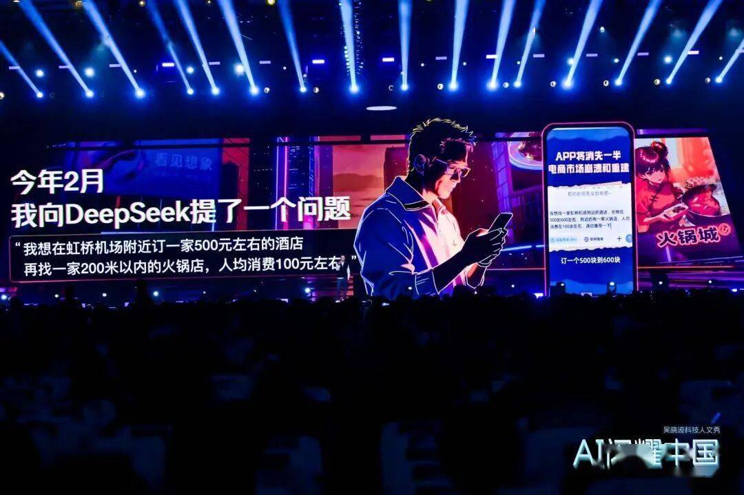 但你们能蹲几分钟马步?将来五年,这600万家中国工场中仍然有良多企业从蹲马步,他们宁可把企业卖掉、关掉,上半场就竣事了,但他们就是关不掉,就是卖不掉,有的是不舍得,有的是不甘愿宁可。我也不认为这600万家中国工场都能看到明天的太阳,可是至多人工智能给了我们一次机遇,给了我们一次提高效率、降低成本、扩大营销、熬炼员工的机遇。你们记得望崽吗?他所正在的企业叫什么名字?你们可能忘了,我也忘了。为什么忘了?由于它太通俗了,它就是中国600万家企业中的一家。可是就这么一家我们听完就健忘它名字的企业,通过手艺变化正在提高本人的效率,它无机会活得有滋有味。所以率先利用东西、率先拥抱人工智能,是这600万家中国工场正在将来需要配合完成的使命。本年2月,我从杭州坐高铁去虹桥,用DeepSeek提了个需求:我想正在虹桥附近订一间500元摆布的酒店,再找一家200米内、人均消费100元的暖锅店。几分钟后,它就给出了精准的酒店和暖锅铺保举。看到成果的时候,我当即拍了条短视频,婉言“APP将会消逝一半,电商市场即将解体”。我说这句话,比马斯克早了整整十个月。
