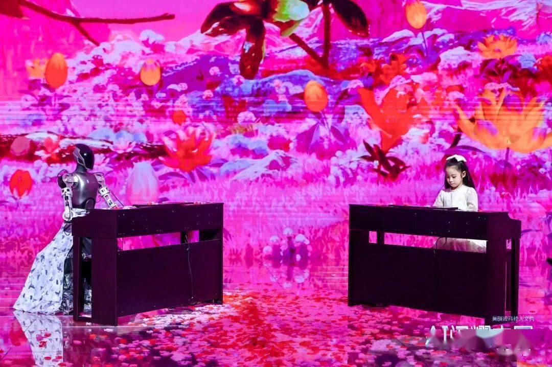 我完全分不清。一个是硅基人类,一个是碳基人类,他们用本人的双手正在弹奏一首《花开正在面前》。我想如许的场景指向一个正正在发生的将来。