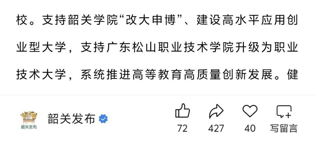 此中,正在高档教育方面,明白两大沉磅支撑政策:一方面支撑韶关学院推进“改大申博”计谋,扶植高程度使用创业型大学;另一方面支撑广东松山职业手艺学院升格为职业手艺大学!